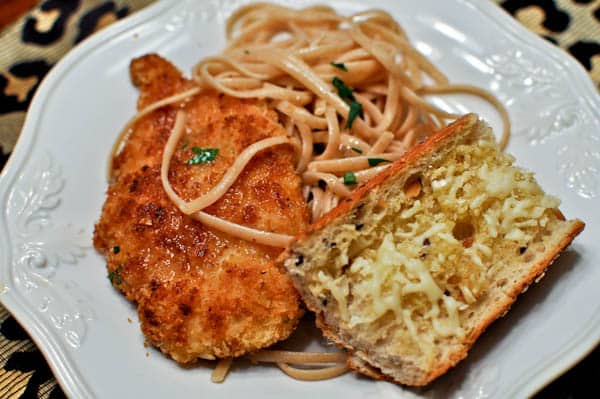 Tonight, I decided to try out chicken piccata for our Sunday dinner. Not only have I never made it, I don’t even think I’ve ever tried it. Remember – I’m not Italian and I don’t really love Italian food. So I got to working. I decided on chicken piccata, whole wheat pasta and whole grain parmesan garlic bread. If you’re wondering where the vegetables are, you must not come ’round these parts much.