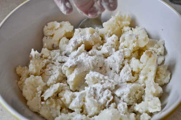 Sprinkle flour on mashed potatoes, add in any mix-in’s and form into patties that are about 1 inch thick.