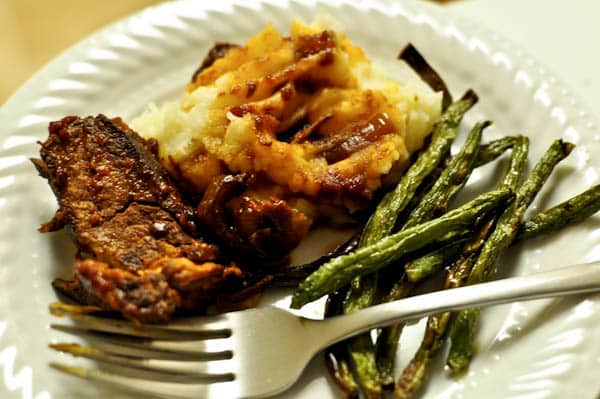 Crockpot pork with homemade BBQ sauce and tons of shallots, roasted green beans and mashed potatoes… because it is impossible to eat too many mashed taters in one week.