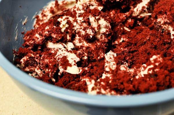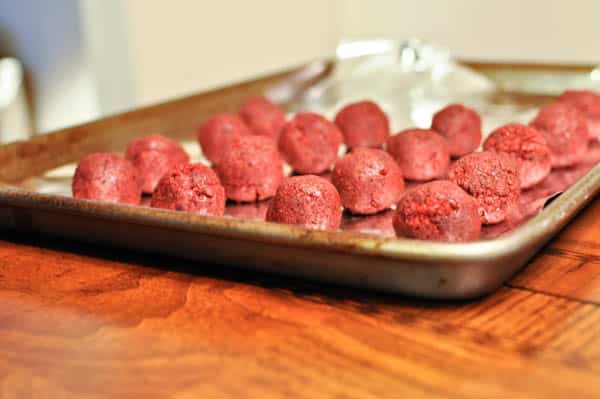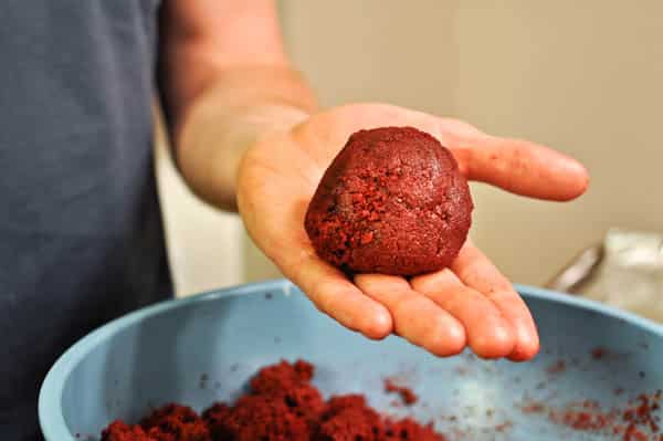 [Mr. How Sweet loves red velvet cake balls. He has been talking about them all year. So I decided to “let” him roll the balls.]