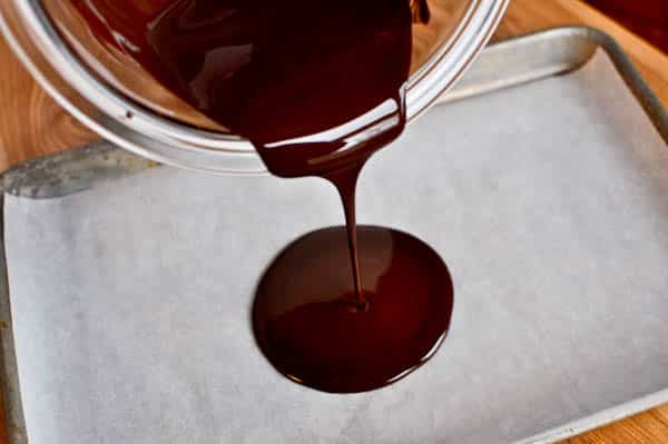 • Melt dark chocolate either in the microwave or a double boiler. Line a baking sheet with parchment paper and pour chocolate on. You can smooth it with a spatula to the thickness you desire. Stick in the freeze for 20 minutes.