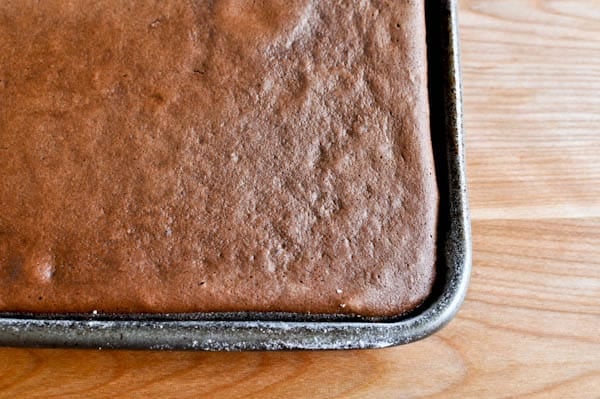 Preheat oven to 350. Prepare your favorite chocolate cake (I used a Devil’s Food boxed mix). Grease and flour a jelly roll pan. Pour batter in the pan and spread around until it’s even. Bake at 350 for 15-20 minutes; this will depend on the cake you bake, but begin to check it after 15 minutes.