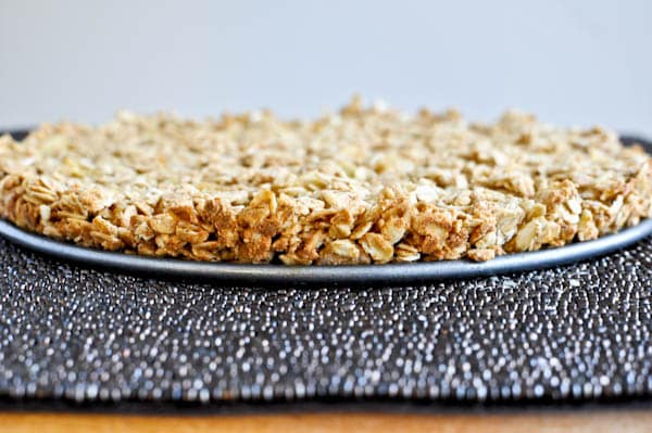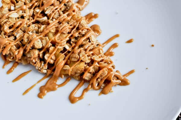 Mix with wooden spoon until all ingredients are moistened. You can even work the dough with your hands to get it all together. Add honey one tablespoon at a time, mixing until everything is combined. Mix with you hands before adding additional honey, but add it one tablespoon at a time if needed. You want the dough to be sticky, but not too wet. Spray a springform pan or pie plate with non-stick spray and pour in oat dough. Spread it evenly in the pan and give the top a quick spray with non-stick spray – it will help hold it together. Bake at 350 for 18-20 minutes. Let cool for 15 minutes before cutting. Slice into wedges and top with more melted peanut butter.