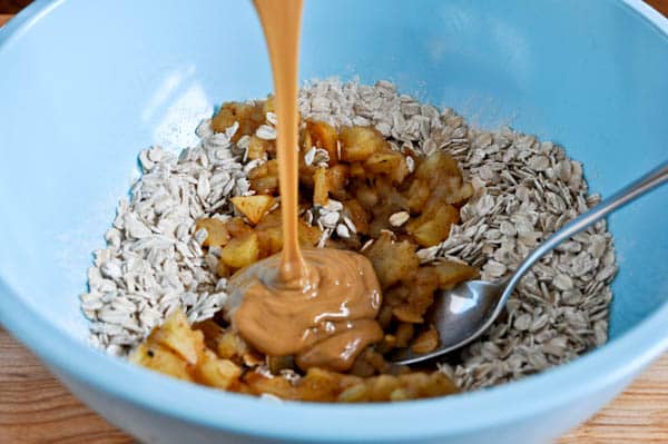 In a large bowl, combine oats, flour, 1/2 tablespoon cinnamon, salt and baking powder and mix. To soften apples, mix them with 1/2 tablespoon of cinnamon and microwave for 2-3 minutes, or pan roast on medium heat for 10 minutes. Once apples are soft, mash them with a fork making sure to leave some large chunks. Add apples into oat mix. Melt peanut butter and stir vanilla into peanut butter. Add peanut butter to apples and oats.