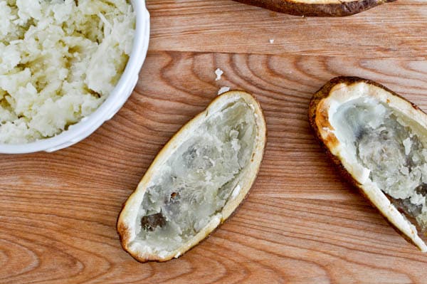 - Once cool, slice around the inside of the potato and scoop out the flesh, be careful not to poke holes in the bottom (it’s okay if you do – it happens!). Put scooped potatoes in a bowl and mix with 1/2 cup mozzarella and 2 tablespoons each of peppers, mushrooms and pepperoni. Mix well. Scoop mixture back into potatoes and spoon pizza sauce over top. Add more toppings and cheese. Bake for 10-15 more minutes.