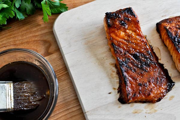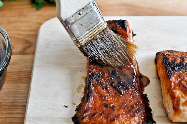 • Remove the salmon from the oven and brush it with the bourbon glaze. Add as much or as little as you would like. Feel free to use it as a dipping sauce too. The glaze can be stored in the fridge for a week or two – just allow it to come to room temperature (or slightly warm it) before using.