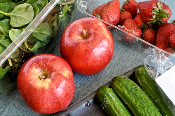 I used 2 apples, about 6 cups of raw spinach, 3 of those little cucumbers, 6 strawberries, and half a lemon.