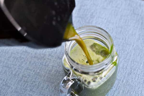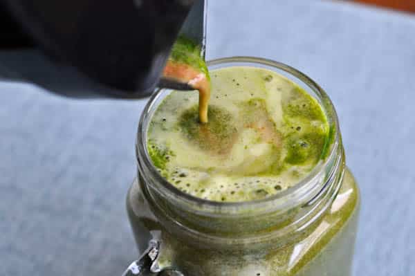 For St. Pat’s I did banana, milk + spinach (which made it green), but then I added vanilla and peppermint extract enough so that I could pretend there was no vegetable in there! :D All “mint”, right?