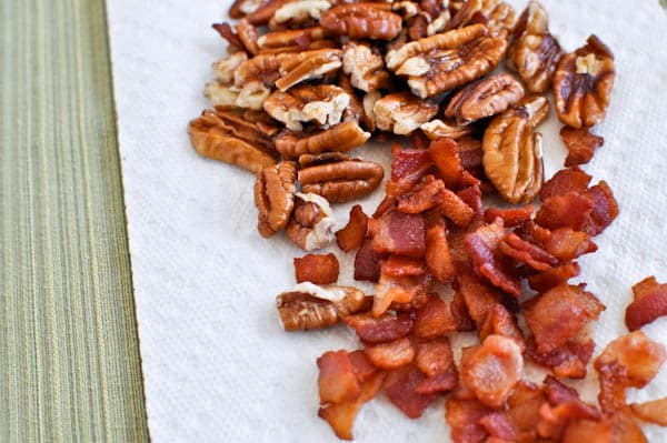 - Heat a large skillet over medium heat and add bacon. Fry until golden brown and crispy, then remove with a slotted spoon and drain on a paper towel. Add pecans and toast for about 6-8 minutes, stirring occasionally so they do not burn. Remove and drain on a paper towel. In the meantime, boil water for orzo and cook according to directions.