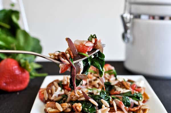 But I need to tell you about all the deliciousness going on here, especially since I couldn’t fit it in the title: crispy bacon, toasted pecans, sweet strawberries, sauteed spinach and garlic, whole wheat orzo, creamy goat cheese, caramelized onions and fresh basil. So much better than the boring, old salad you expected when you saw the title, right?