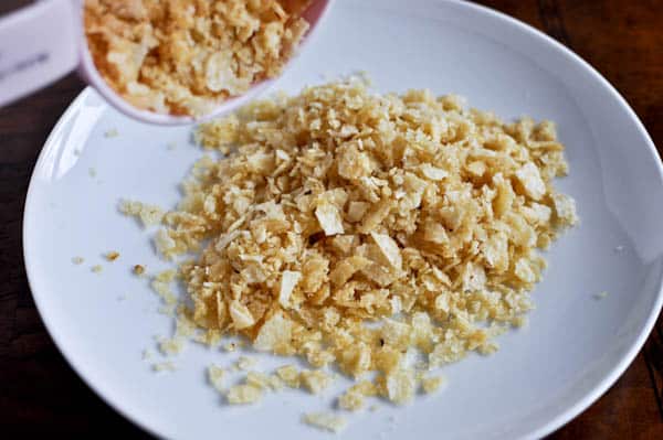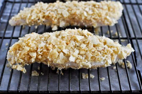 • Preheat oven to 425 degrees. Line a baking sheet with parchment paper and lay a wire rack on top, spraying it with non-stick spray. Add potato chips to a ziplock bag and crush them into fine pieces.