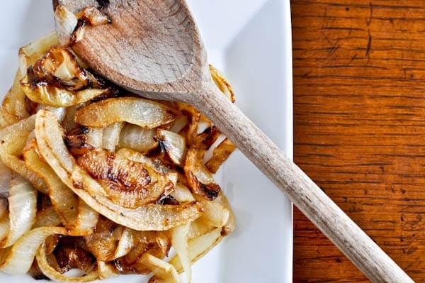 - While burgers are cooking, heat a skillet on medium heat and add olive oil. Add sliced onions with a pinch of salt and saute until caramelized, about 10 minutes.