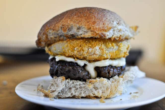 I saw one of those on Diners, Drive Ins, and Dives and have been wanting to try it ever since.. but never did. Imagine my DELIGHT when I see that now only have you make one, but made is special with a Healthy onion ring!! Genius!!!!