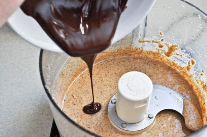 - Spread the almonds out on a baking sheet and bake for 15 minutes, flipping every 5 minutes. While almonds are toasting, add shredded coconut to your food processor and blend until it begins to break down. This will take about 5 minutes or so and will require you to scrape down the sides to keep everything moving. After the coconut begins to break down, add the coconut oil and continue to mix. Once the almonds are finished, add them immediately to the coconut and blend. I find this works best while the almonds are warm. Blend and pulse, scraping down the sides of the processor until the butter comes together. Melt the dark chocolate (I use the microwave, melting it in 30 second increments and stirring until it’s melted) and add to the almond butter. Blend until fully incorporated.