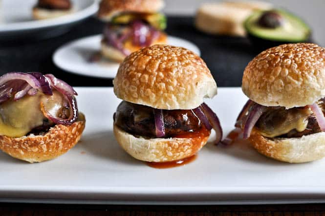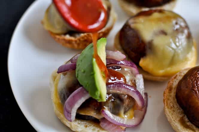 - Assemble sliders by placing the mushroom on the bun, then top with onions, avocado, and a hefty drizzle of bbq sauce.