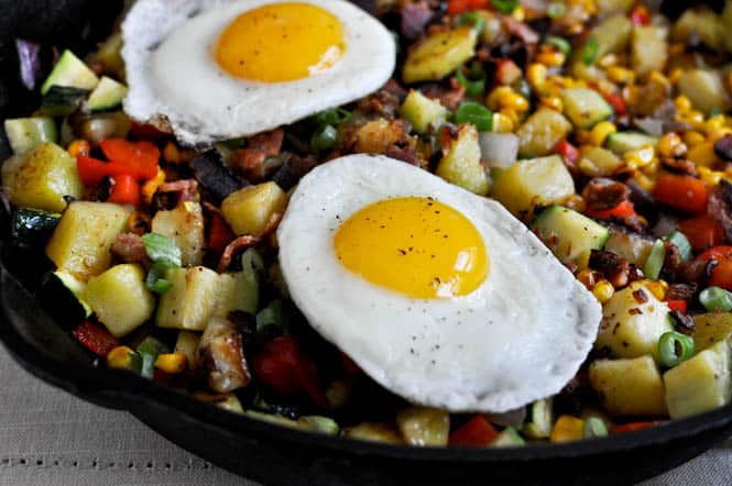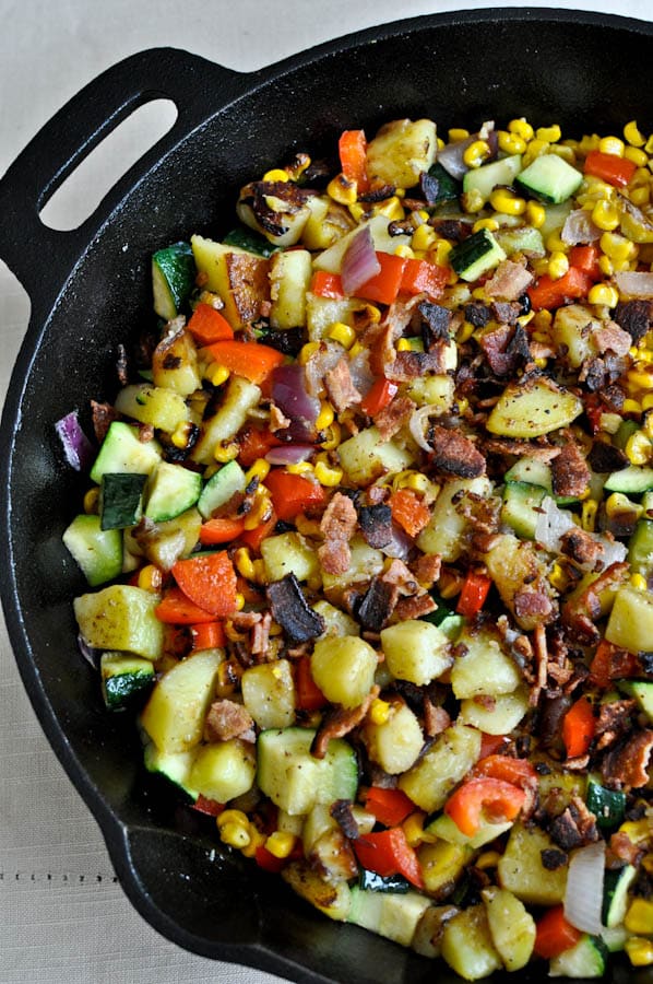 - Add peppers and onions (and another little sprinkle of salt and pepper) to potatoes and cook for another 5 minutes, stirring. At this time you may need to add the additional teaspoon of olive oil depending on how much bacon fat is left. After 5 minutes, add in the zucchini and garlic and cook for 5 minutes more, stirring. Turn off heat, then stir in grilled corn and bacon. Top with sliced green onions. Serve with an egg on top.