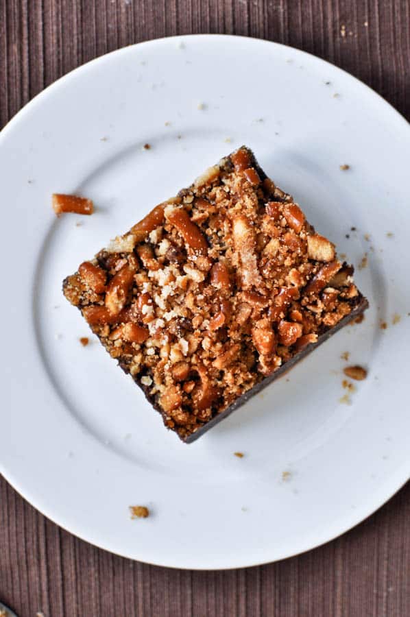 Oh man. So I’ve had this weird brownie craving for the past three days, but since brownies aren’t my usual sweet craving, I didn’t have a recipe on hand. I did, however, remember salivating over several recipes that you had posted for brownies over time. Alas, here I stood in my kitchen early this morning, mixing, measuring, and doing a little too much pretzel-dipped-in-batter-tasting. I KNOW these are going to be amazing because sweet and salty is the best combo everrrrr.