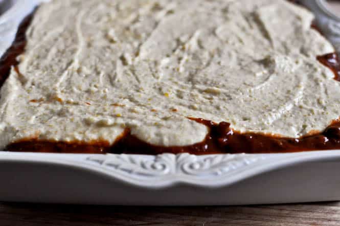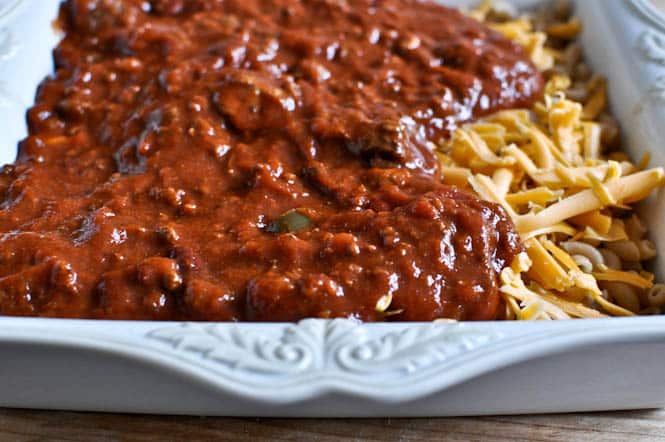 - Spray an 8×8 baking dish with non-stick spray. Add pasta to the bottom of the dish, then layer on the cheese and chili. Top with your cornbread batter, spreading gently with a spoon. Don’t worry if it doesn’t reach the edges.