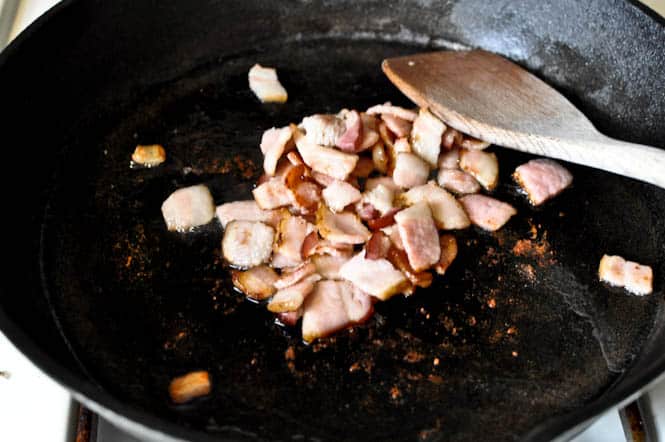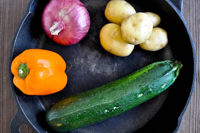 Heat a cast iron (or oven safe) skillet on medium heat. Once hot, add chopped bacon and cook until almost crispy and fat is rendered. Remove from the skillet with a slotted spoon and let drain on a paper towel. Add vegetables and potatoes to skillet and cook for 5 minutes, tossing occasionally. Add garlic and cook for another minute. Remove veggies and potatoes from skillet. Season chicken liberally with salt and pepper and add to skillet. Cook until golden on each side, about 3-4 minutes per side. [Note: if the skillet is drying up feel free to add 1-2 teaspoons of olive oil if needed].