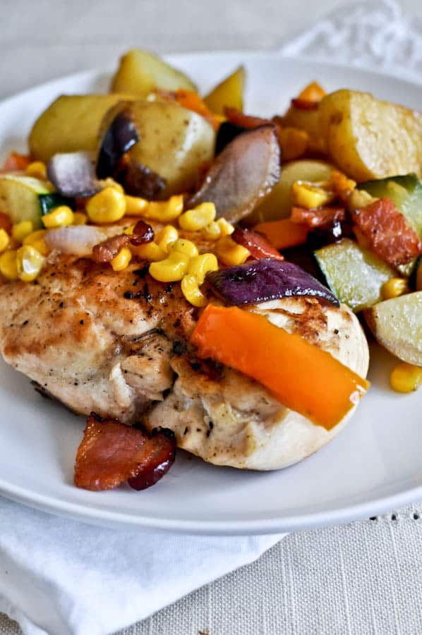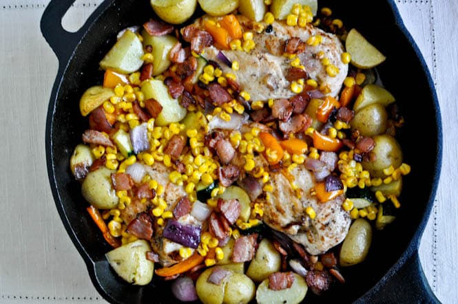 Add veggies, potatoes and bacon back in to the skillet on top of the chicken. Add corn, then place in the oven uncovered and cook for 20 minutes.