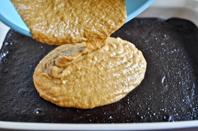 - In a small bowl, beat eggs and vanilla and set aside. In a double boiler, add butter, cocoa, sugar and salt. Mix until the mixture becomes a batter – this will take approximately 10 minutes and at first will just look like clumps of cocoa power. Be patient! Remove the bowl from heat and whisk in the egg mixture (very slowly while whisking, so you don’t have scrambled eggs!) until combined. Stir in flour until batter is smooth, then pour in baking dish. Use a 9×13 dish for thin bars, and an 8×8 for thicker bars. For 9×13 dish, bake for 12-13 minutes. For an 8×8 dish, bake for about 18-20 minutes. Remove from oven and let cool completely! Then make pumpkin layer.