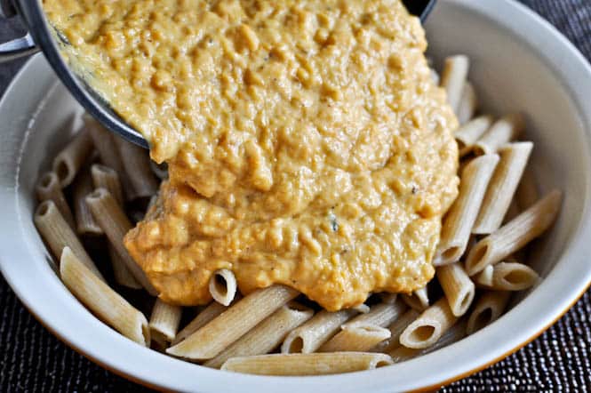 I gotta come clean and tell you that this is totally a cheaters meal. After I made that butternut squash lasagna, so many of you suggested just making a pasta version, minus all the lasagna junk. Uh, why didn’t I think of that? I swear… I can never come up with anything creatively simple. This is easier to throw together and tastes equally as amazing. It’s pretty much the exact same thing, just mashed to high heavens and piled on top of penne in a pie plate.