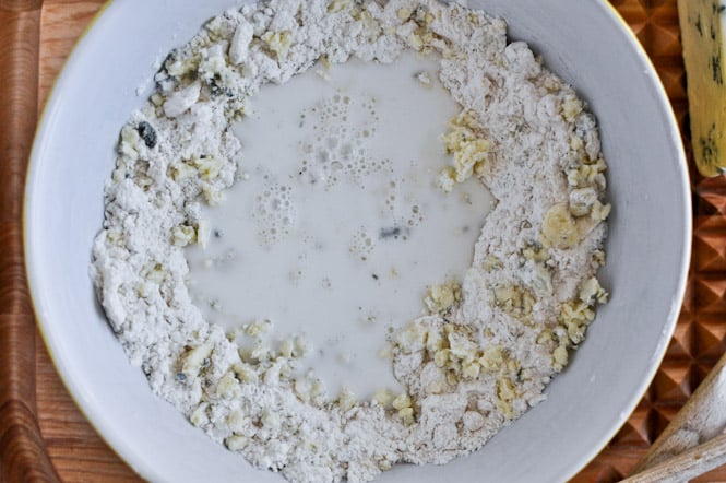 In a large bowl, combine flour, sugar, salt, baking powder and soda, and whisk until combined. Using a fork, pastry blender or your hands, add butter pieces to the flour and mix until coarse little crumbles remain. Add in crumbled gorgonzola. Pour in milk and stir with a spoon until just combined, not overmixing. Use your hands if needed to bring the dough together – I did.