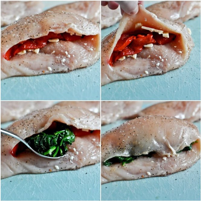 Add 1/2 ounce of parmesan and goat cheese inside each piece of chicken, pressing it as far back as it will go (you can do this while spinach is cooking). Add 1-2 slices (or more) of roasted red pepper, then add equal amounts of spinach into each piece of chicken.