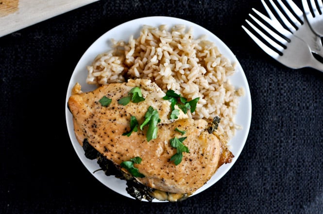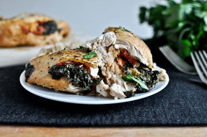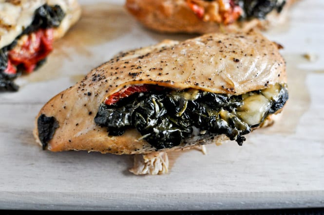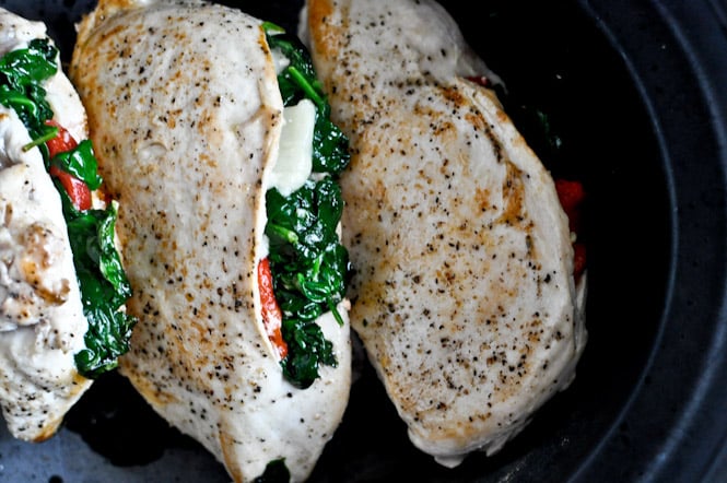 Crockpot Stuffed Chicken Breasts with Spinach, Roasted Red Pepper, Parmesan + Goat Cheese