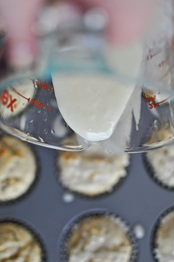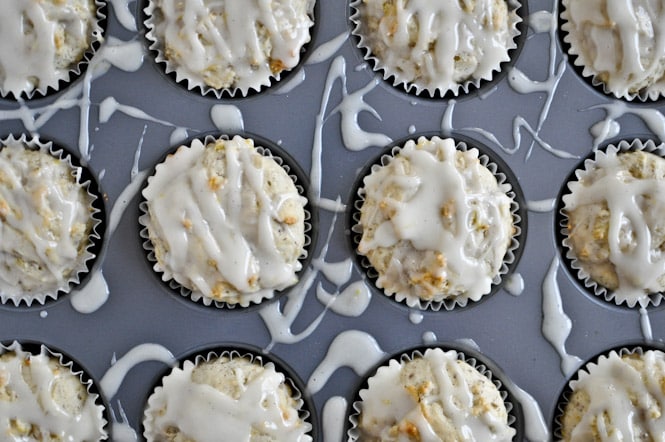 Bake for 14-17 minutes, or until muffins are set and no longer jiggly in the middle. While muffins are baking, mix glaze, and as soon as they come out of the oven, drizzle glaze over top. These are best served warm, straight from the oven.