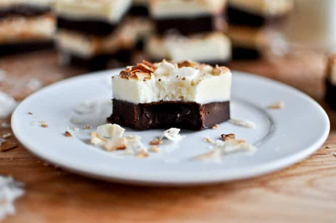 • Note: the melting can also be done in the microwave. I suggest melting the chocolate first on medium power in 30 second increments, stirring after each time. Once melted, add in remaining ingredients and stir until smooth. You can also use this Lindt Coconut White Chocolate for the coconut layer.