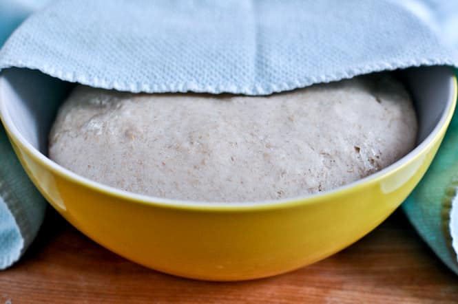After kneading, remove dough and form into a ball with your hands. Brush a large bowl with 1 teaspoon of canola oil and add the dough, turning to coat. Place in a warm area and cover with a slightly damp towel to rise for 1-1 1/2 hours.