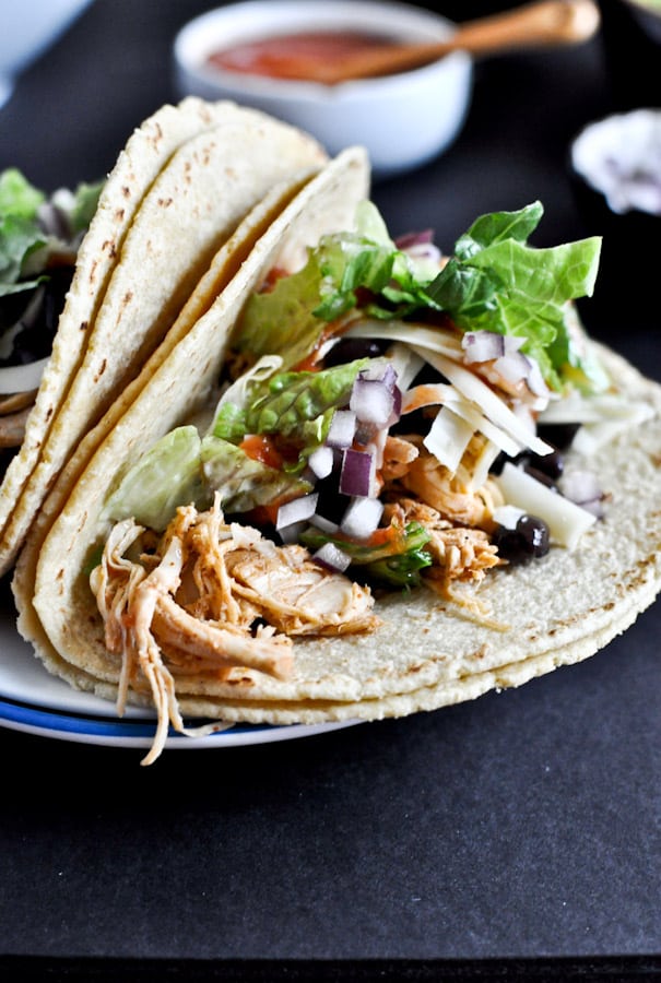 When you first remove the lid, it will seem as though there is a lot of liquid and the chicken is just sitting in it, but take two forks or kitchen tongs and shred, shred, shred until it all comes together. Taste and season with additional taco seasoning if desired, then let sit in the crockpot for another 15 minutes or so. Turn the crockpot completely off, and right before serving toss in cheddar cheese. Once combined, immediately transfer the chicken to a large bowl so the cheese does not stick to the crockpot. Make your tacos!