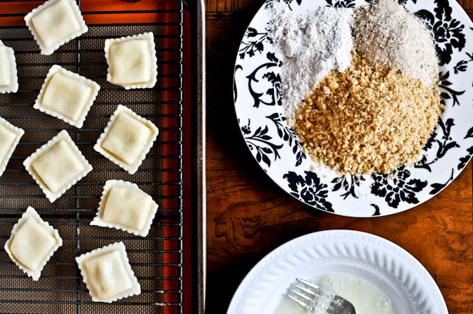 • Bring water to a boil and cook ravioli for half of the recommended time. I let mine boil for a little over 2 minutes, then drained them and quickly spray through them with nonstick spray to help them not stick together. Once cool to the touch, dip each ravioli in egg whites then coat thoroughly with the breadcrumb mixture, pressing to adhere. Place on the wire rack and repeat until finished. Spray each with a quick hit of nonstick spray. Bake for 15-18 minutes, or until crispy and golden.