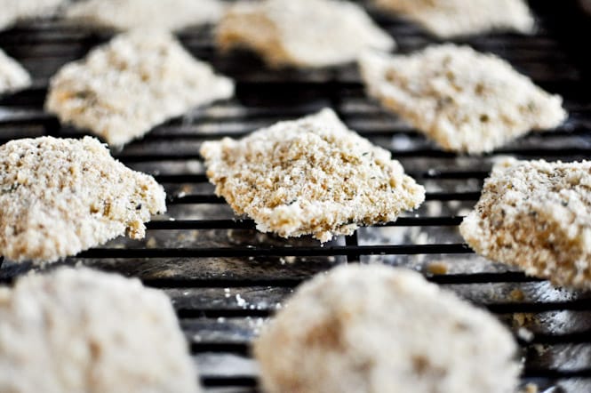 • Preheat oven to 450 degrees F. Line a baking sheet with aluminum foil and place a wire rack on top. Spray the rack with nonstick spray. Add egg whites to one bowl, and in a larger bowl mix flour, bread crumbs, panko, romano, salt and pepper.