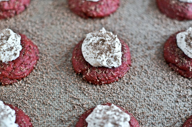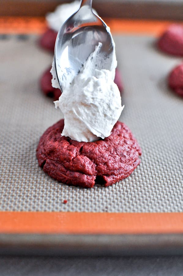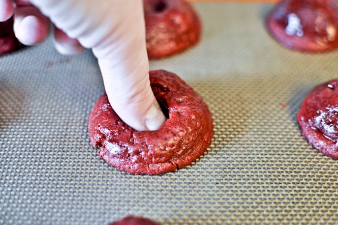 Red Velvet Thumbprints With Marshmallow Frosting.