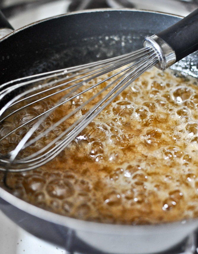 In a small saucepan, heat butter until melted. Whisk in brown sugar until dissolved, then let it bubble for 1-2 minutes. Remove from heat and whisk in peanut butter. The mixture will be liquidly. Whisk in vanilla. Let sit and cool completely, about 20 minutes.