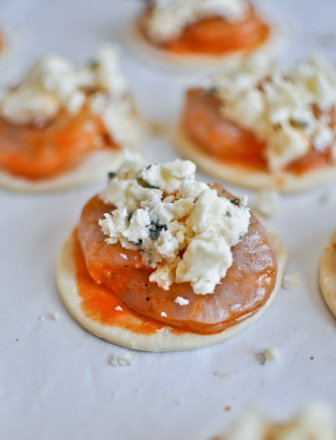 Melt butter (I did so in the microwave for 20 seconds) then mix with buffalo sauce. Using a pastry brush, very lightly brush a bit of sauce on each pastry round. Add shrimp to a large bowl, toss with salt and pepper, then coat with the remaining buffalo wing sauce.