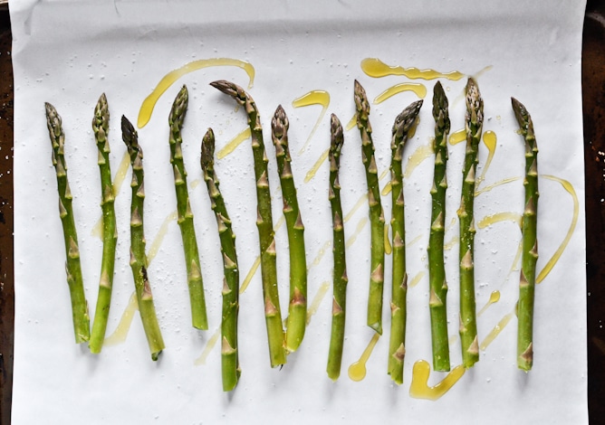 Preheat oven to 400 degrees F. Lay asparagus on a baking sheet and toss with 1/2 tablespoon olive oil and a sprinkle of salt and pepper. Roast for 20-22 minutes.