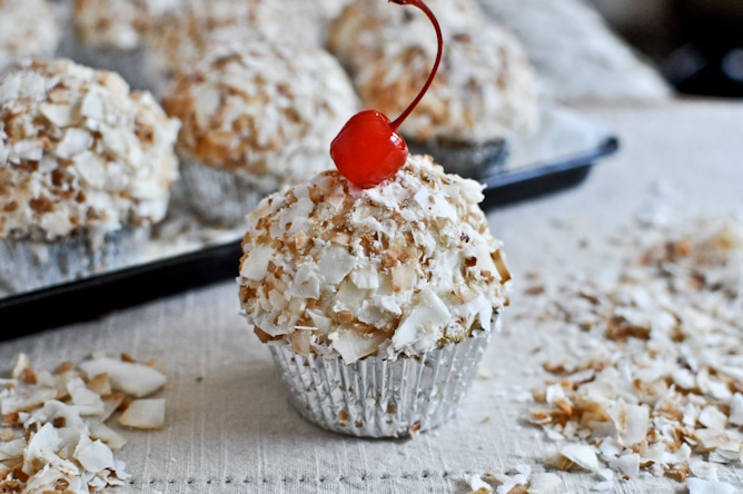 To frost: In the bowl of your electric mixer, beat whipping cream until peaks for and it is stiff enough to frost cupcakes, then mix in the rest of the vanilla and coconut extracts, and powdered sugar. Place in the fridge until ready to use. Once ready to frost, spoon a large 1/4 cup of whipped cream on top of cupcake and smooth with a spatula. Roll the tops in toasted coconut then garnish with a cherry. These are best when refrigerated, but are fine when sitting out for a few hours at a party, etc.