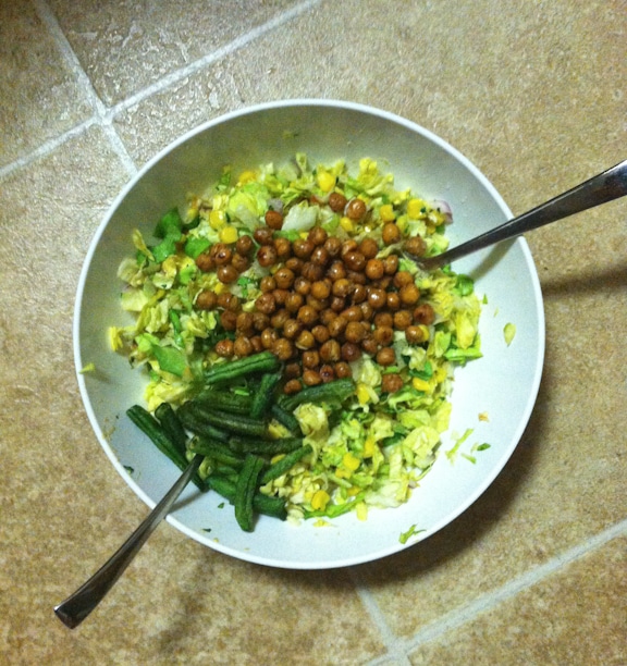 Don’t be fooled: that is chopped lettuce, rice, my copycat chipotle corn salsa, a ton of guacamole and roasted chickpeas. Oh – and those aren’t REAL green beans. They are the crunchy dried green beans from Trader Joe’s. I wanted to make a chipotle burrito bowl, but I had no black beans… or chicken… or pork… or an appropriate cheese.