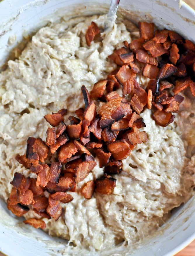 This bread is chock full of your traditional bananas (um, duh), a hint of peanut butter, and lots of crumbled bacon. Oh… and even some bacon grease. Yesssss. I did.