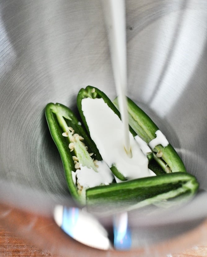 - The night before, add heavy cream and jalapenos to a bowl, muddle with a muddler or something like a fork, and let soak until you’re ready to serve. Before serving the fritters, strain cream through a fine mesh strainer to remove any seeds and add it to the bowl of your electric mixer. Beat cream on medium-high speed until peaks form, then add in sugar and beat until thicken. Keep cold in the fridge until ready to serve.