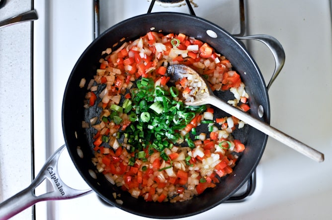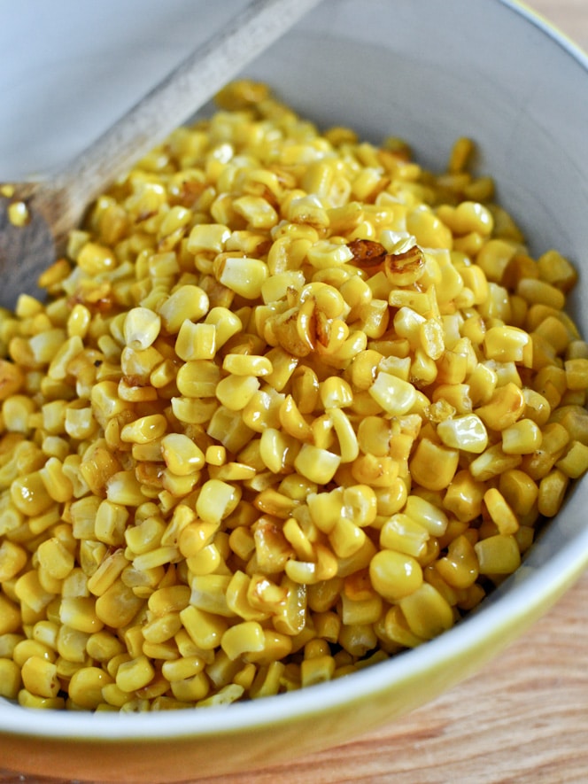 Note: this recipe works best with fresh, cooked corn straight off the cob (and caramelized), but since its not in season here yet, I used frozen corn that was thawed and completely dry.