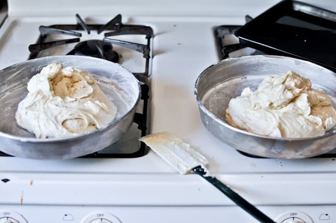 Pour batter in two 8-inch buttered and floured cake pans. Bake for 23-25 minutes, or until cake is not jiggly in the middle and golden on top. Let cool completely before frosting.