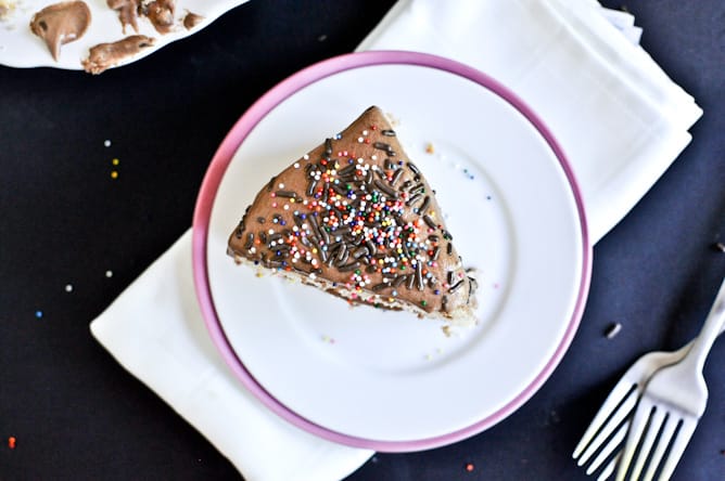So… a cake it was. Plain old yellow cake with this chocolate frosting straight from Mother Lovett’s recipe arsenal – and let me tell you: it is fudgy. It’s different… in that you cook the mixture and let it cool then whip the heck out of it (hence the lighter color)… and it doesn’t get as sturdy or solid as a traditional buttercream, but it’s perfect for throwing on top of cakes and cupcakes in that casual but oh-so-cool way. Which is totally me, considering I have zero patience to frost a real cake the real way. This just… works. And covered in sprinkles… it’s totally mom-worthy.