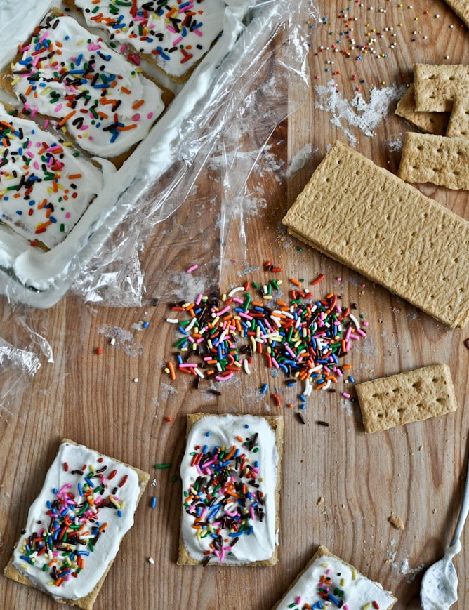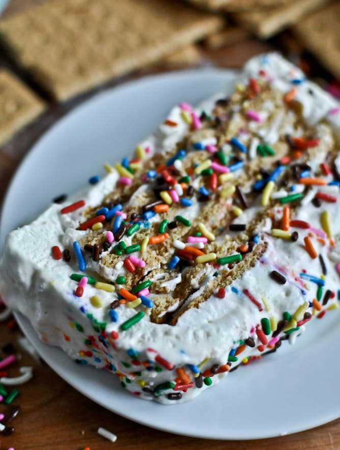 This was my first time shoveling an icebox cake into my mouth, and while I was wary (I mean I think we all know my stance on s’mores, but regular graham crackers can go take a hike) and couldn’t understand just HOW it worked, I was a giant, giant fan. I loved this so much more than I thought that I would. The grahams really do get cakey and soft between the layers of homemade cake batter pudding, fresh whipped cream, and eight billion sprinkles. I wish I could wear this as a hat.