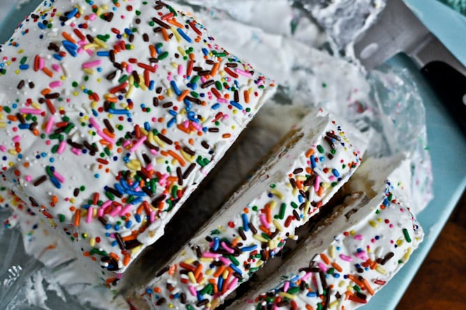 - Remove from freezer and lift the cake out, flipping over onto a small pan or cutting board that will fit in the freezer. Spread whipped cream all over cake for a finishing presentation, then cover in sprinkles. Freeze for at least another 2 hours, or as long as needed. When ready, cut and serve immediately. Additionally you can just scoop it out of the pan and serve it in bowls. Keep in the freezer.