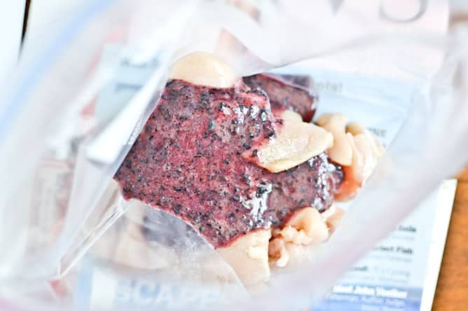 Cut chicken into 1 or 2-inch chunks, then season with salt and pepper. Add chicken to a baking dish or large ziplock bag. In the bowl of a food processor (or blender), add blueberries, olive oil, lime juice + zest, vinegar, garlic, basil and cilantro. Blend until smooth, then add mixture into bag or on top of chicken in a dish, coating evenly. Refrigerate and marinate for 2-24 hours.