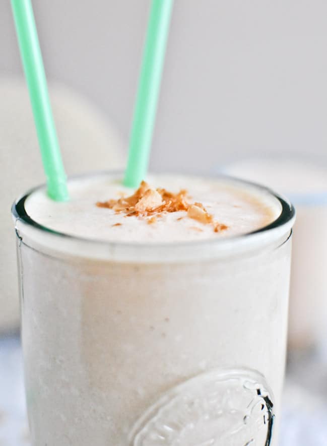 Combine all ingredients together (except for toasted coconut) in a blender and process until smooth! Garnish with toasted coconut. Drink up.